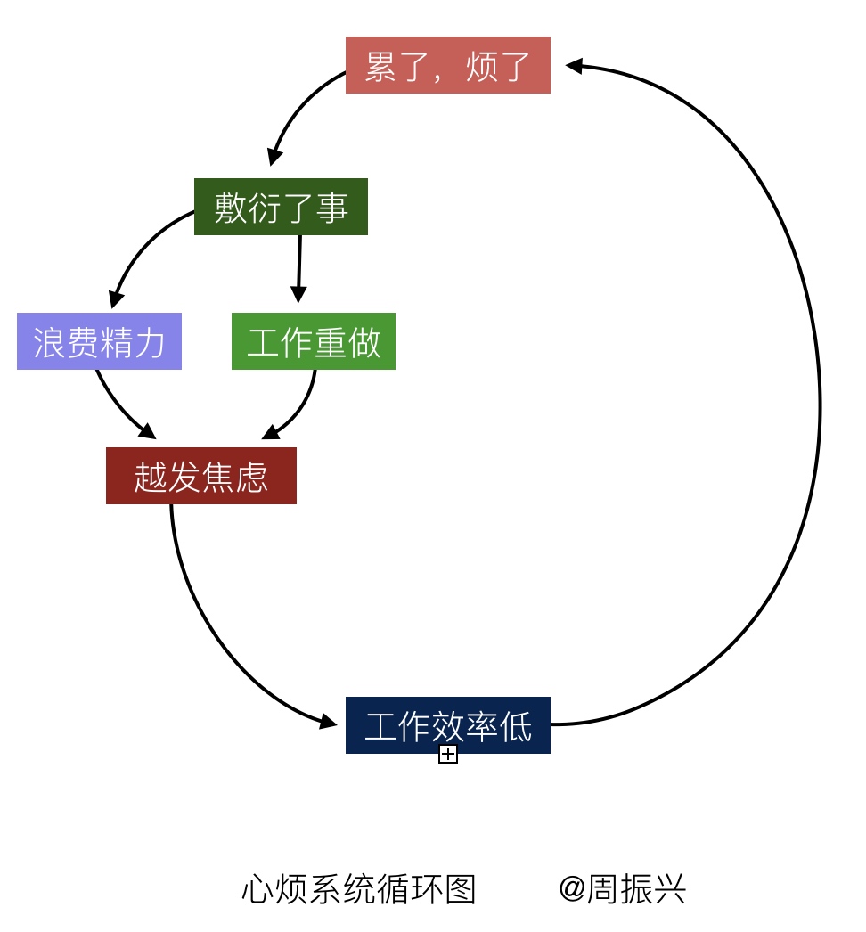 根据系统循环图来看,你的工作效率越低,心烦的程度就就大,这就演变成了一个恶性循环系统。